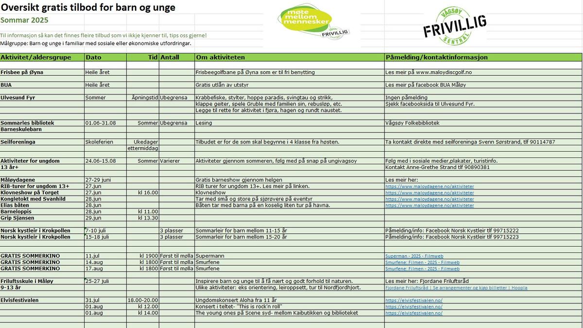 Kinn kommune tilbyr gratis deltakelse på diverse sommeraktiviteter av midler tildelt av BufDir til ferietilbud og ferie for alle. Sjå liste vedlagt og kontakt oss gjerne.Informasjon om sommeraktiviteter for barn og unge i Måløy,